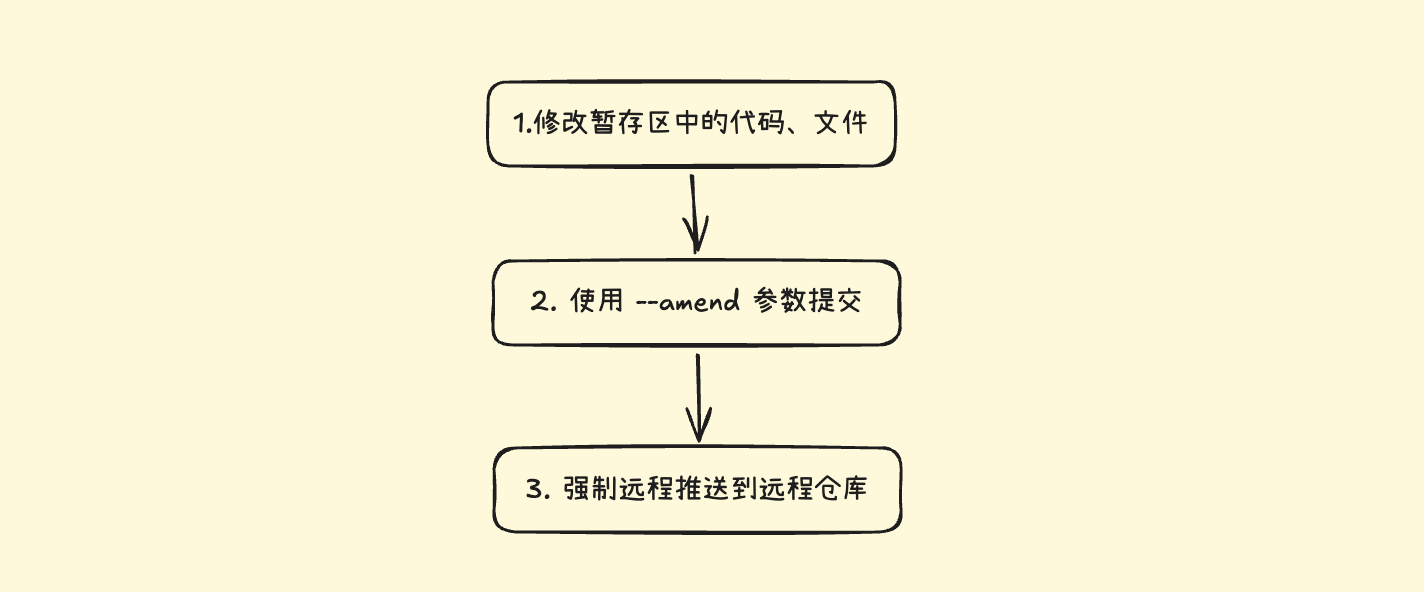 通过git commit --amend -m "改动后的提交注释" git commit --amend --no-editgit commit --amend指令将暂存区改动合并到上一次提交,若不需要改动提交注释,可以使用--no-edit参数沿用上一次提交的提交注释 - 强制推送到远程仓库